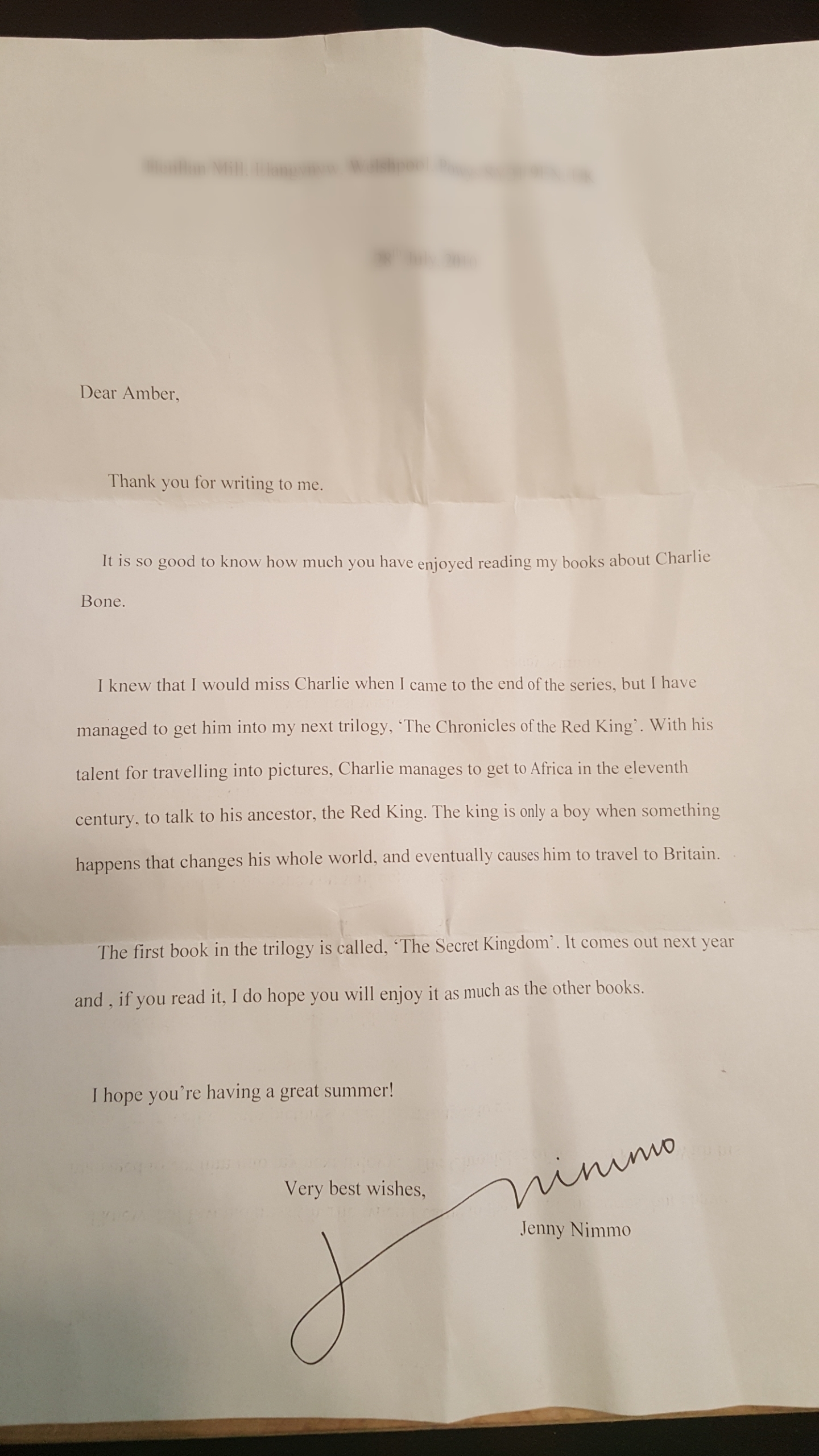 I can’t remember exactly what I’d read right after finishing Nimmo’s books, but the point is that the seeds for my love of reading had been planted with both Blume and Nimmo’s works. I enjoyed Charlie Bone so much that, for another school assignment, I got to write a letter to Nimmo, and I actually got a response!